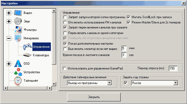 В подразделе Управление появились две новые настройки. Если мигание индикатора ScrollLock на клавиатуре при записи и в режиме отложенного просмотра относится к разряду приятных мелочей, то чекбокс, активирующий режим Master/Slave, заслуживает дополнительных пояснений. Поддержка режима «картинка-в-картинке» (Picture-In-Picture, PIP) при наличии второго устройства видеозахвата (выбор осуществляется в разделе Устройства) была реализована ещё в программе FlyDS, наработки которой легли в основу GoTView PRO. Master/Slave предусматривает полноценную работу двух копий одной программы с двумя устройствами без необходимой для этого ранее физической установки второго экземпляра с последующим внесением изменений в конфигурационные файлы. Независимо от последовательности выхода при следующих запусках программа работает с основным устройством. Единственное ограничение — отсутствие поддержки тюнеров сторонних производителей.