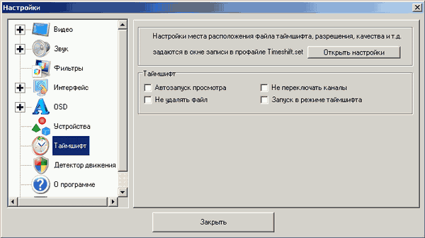 Настройкам режима отложенного просмотра (автозапуск просмотра, удаление буферного файла, блокировка переключения каналов, запуск при старте программы), посвящён раздел Таймшифт. Настройки параметров потока также доступны и в меню записи.