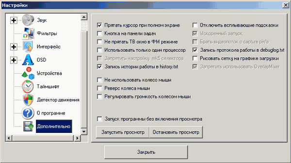 В дополнительных настройках (напомним, что для отображения активируется в подразделе Управление) находятся такие опции, как ускоренный запуск программы, работа на одном процессоре/процессорном ядре, запись протокола работы в файл (может быть полезна при обращении в службу поддержки производителя) и запуск программы без включения просмотра.