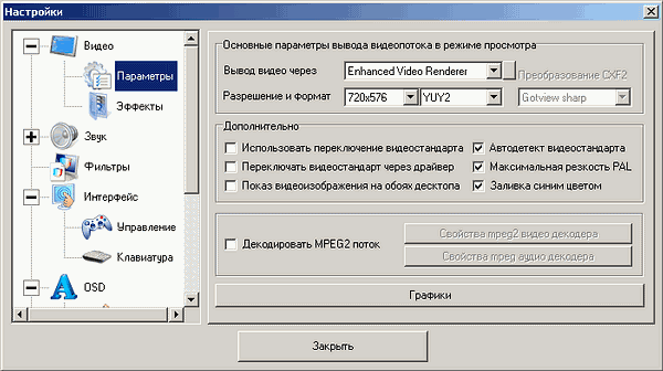 При работе с цифровыми каналами доступны только настройки масштабирования, выбор видеорендерера и параметры выбранного декодера.