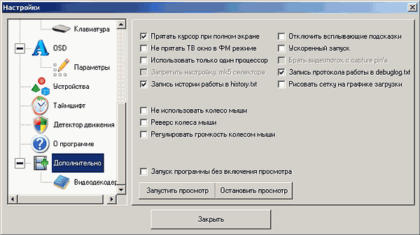 В дополнительных настройках (напомним, что для отображения активируется в подразделе Управление) находятся такие опции, как ускоренный запуск программы, работа на одном процессоре/процессорном ядре, запись протокола работы в файл (может быть полезна при обращении в службу поддержки производителя) и запуск программы без включения просмотра.