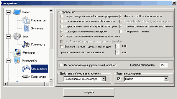 Подразделу Управление в последнее время везёт. На этот раз ему досталась опция включения всплывающей панели в полноэкранном режиме. Напомним о режиме Master/Slave, отличающемся от давно реализованной «картинки-в-картинке» (Picture-In-Picture, PIP) при наличии второго устройства видеозахвата (выбор осуществляется в разделе Устройства). Master/Slave (для активации настройки необходимо снять запрет на запуск второй копии программы) предусматривает полноценную работу двух копий одной программы с двумя устройствами без необходимой для этого ранее физической установки второго экземпляра с последующим внесением изменений в конфигурационные файлы. Независимо от последовательности выхода при следующих запусках программа работает с основным устройством. Единственное ограничение — отсутствие поддержки тюнеров сторонних производителей.