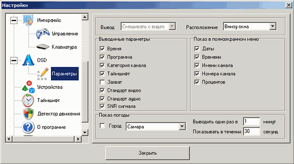 Подраздел Параметры позволяет выбрать показатели, выводимые на экран в оконном и полноэкранном режиме. Для отображения дополнительной информации используется кнопка «С». О появлении функции показа погоды (требуется Интернет-соединение) мы уже говорили в обзоре PCI DVD3 Hybrid, об отображении мощности сигнала как в цифровом, так и в аналоговом режиме, реализованной для всех тюнеров компании, оснащённых приёмниками от Xceive — в обзоре PCI Hybrid. Несмотря на то, что при работе с аналоговым вещанием результат выдаётся в виде двух значений с шагом 10 dB («40-50 dB», «50-60 dB» и т. д.), даже в таком виде он способен значительно облегчить поиск возможных причин ухудшения изображения. Раскроем маленький секрет — чекбокс, отвечающий за мощность, имеет второе дно, при повторном нажатии будет выводиться некое среднее значение отношения сигнал/шум (ОСШ, SNR), выдаваемое ВЧ-блоком.