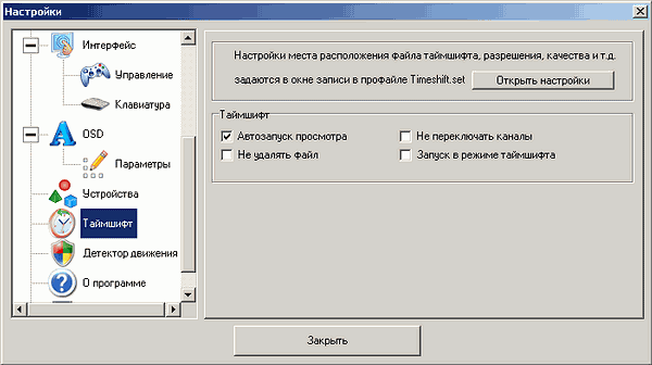 Настройкам режима отложенного просмотра (автозапуск просмотра, удаление буферного файла, блокировка переключения каналов, запуск при старте программы), посвящён раздел Таймшифт. Настройки параметров потока также доступны и в меню записи при редактировании одноимённого профиля.