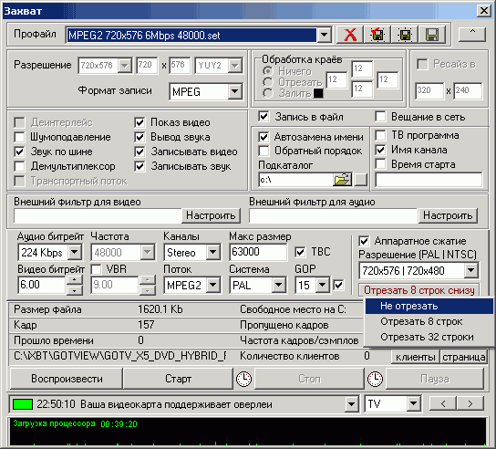Напомним об уникальной для тюнеров с поддержкой аппаратного сжатия в MPEG1/2 возможности обрезания 8 или 32 нижних строк при записи с помощью кодировщика.
