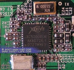 Приёмная часть тюнера преподносит сразу два сюрприза. Первый заключается в использовании последней разработки лидирующей в производстве полупроводниковых ВЧ-блоков компании Xceive Inc. XC5000ACQ (цвет текстолита на снимке обусловлен использованием для фотосессии несерийного экземпляра тюнера), второй — в наличии экранирующего кожуха (несущего больше эстетическую нагрузку, нежели реально защищающего от помех, микросхема приёмника имеет собственное экранирование), отсутствующего у других моделей компании с приёмниками от Xceive.