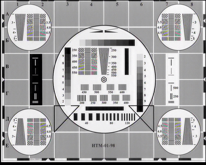 Реализованный в АЦП 3D Comb Filter заслуживает более подробного рассмотрения. Надо сказать, что пользователи с вещанием в SECAM плодами прогресса воспользоваться не смогут, эта возможность доступна только для PAL или NTSC. За активацию фильтра отвечает чекбокс Максимальная резкость в PAL в подразделе Параметры раздела Видео. Отключить дополнительное Y/C-разделение, тем самым уравняв АЦП в правах с CX23885, можно изменив значения параметров Enable3DComb и Use3DComb в системном реестре с «0» на «1». При тестировании использовался видеофрагмент, полученный из тестового изображения в разрешении 720×576. Приём эфирного аналогового канала моделировался при помощи генератора испытательного сигнала «Муссон-007», к входу которого был подключен DVD-проигрыватель BBK DV964S, воспроизводящий тестовый фрагмент. Результаты представлены ниже.