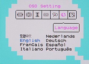 Продаваться монитор по идее должен с русским руководством, но вот меню на первых порах точно не будет русифицированным. Впрочем, оно несложное, да и пиктограммы помогут разобраться, что к чему, даже не знающему английский (или любой другой из 8 языков) пользователю. Шрифт меню удобочитаемый, навигация осуществляется тремя кнопками, поэтому для выхода из главного меню или подменю нужно совершать дополнительные действия, но привыкнуть можно. Настраивается положение меню на экране, тайм-аут автоматического выхода из меню, прозрачность, цвет окантовки.