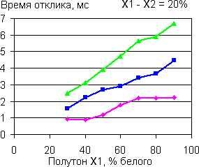 Мы измерили времена отклика при переходах от черного к белому и между полутонами. В случае полутонов мы проводили три вида измерений: для фиксированного полутона (X) измеряли время отклика при переходе от черного до X, от X до белого, и для перехода между полутонами в окрестности X, отстоящими от X на фиксированное значение (мы выбрали его равным 10%, так как считаем 20% минимальной имеющей значение разницей между полутонами).