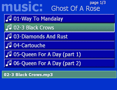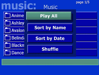 В списке музыкальных файлов поддерживается сортировка по названию, дате, воспроизведение всего списка и случайное воспроизведение.