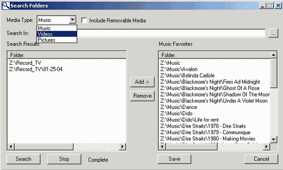 Опции Music, Video и Pictures используются для добавления соответствующих файлов в список, аналогично уже описанной выше утилите поиска.