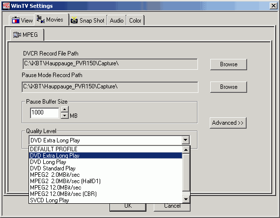 Несмотря на наличие в настройках профилей для записи в MPEG4, эти опции при использовании WinTV-PVR 150 неактивны.