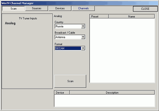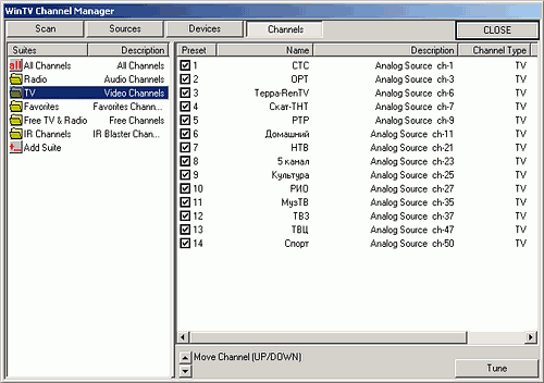 Отсутствие настроек каналов объясняется доступом к ним посредством отдельного модуля WinTV Channel Manager.