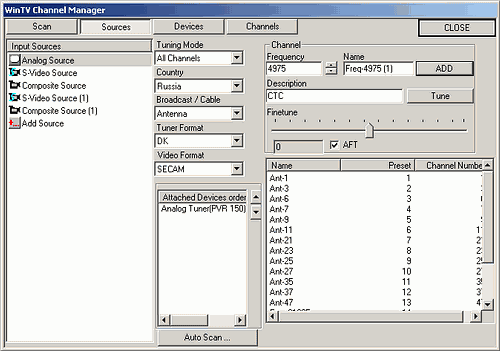 Присутствует ручное добавление каналов, причём не только по номеру, но и по частоте, для чего в списке Tuning Mode необходимо вместо Channels by Country выбрать All Channels. Изменить систему цветности (драйвер не поддерживает автоматическое определение) для уже существующих каналов нельзя, но при ручном добавлении это ограничение не работает.
