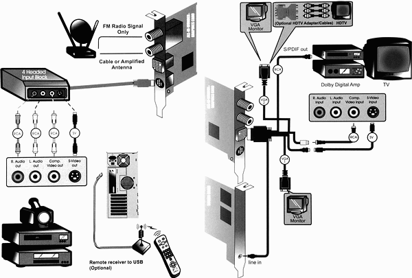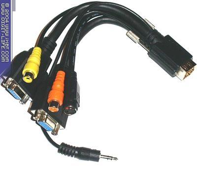 - Переходник-разветвитель для подключения к выходному разъему (2 VGA-разъема, S-Video, RCA для композитного сигнала, разъем mini-jack для подключения к линейному входу звуковой карты и S/PDIF для подключения к внешнему декодеру Dolby Digital)
