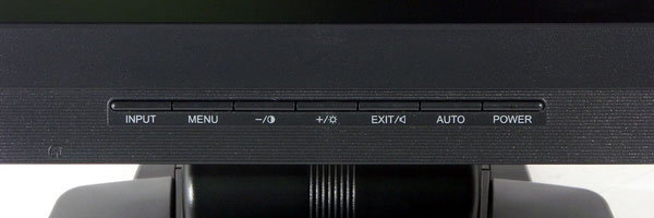Снимаем защитный целлофан, ставим монитор на стол и осматриваем: два входа, — цифровой DVI-D и аналоговый D-Sub, штекер для стереокабеля и выключатель питания. На передней панели в центре ряд кнопок по управлению меню и два динамика по бокам. Также есть вход для наушников. C задней стороны корпуса монитора наблюдаем точки крепежа для подвешивания.