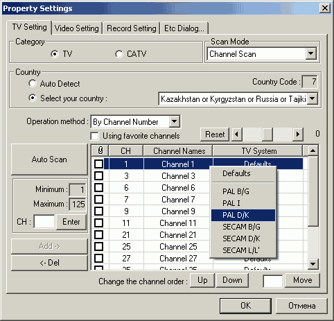 Поддерживается поиск каналов по диапазону (антенный, кабельный) и по частоте (к слову, до сих пор не всегда корректно работающий в программах некоторых маститых конкурентов). Возможно и ручное добавление. Для каждого канала доступна ручная установка системы цветности. Не обошлось и без недоработок, так, русскоязычные названия каналов некорректно отображаются в основной панели.