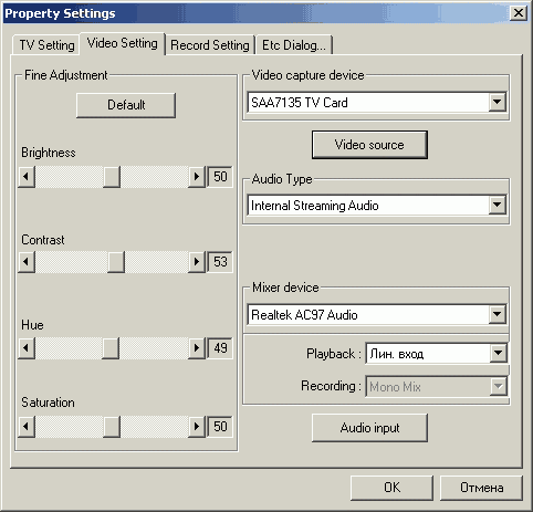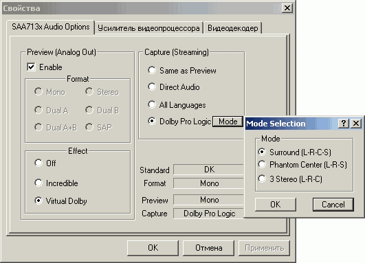 Кнопка Video Source открывает доступ к настройкам драйвера, в частности, к опциям дополнительной обработки звука Philips Incredible и Virtual Dolby Surround (только для SAA7135 HL/101). В последнем случае можно выбрать один из трёх режимов — Surround (L-R-C-S), Phantom Center (L-R-S) и 3 Stereo (L-R-C).