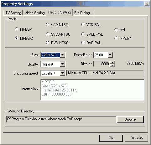 Для записи в MPEG1/2 используется кодек от Honest Technology, уступающий по качеству конкуренту от InterVideo. Кроме использования нескольких стандартных профилей, пользователю разрешено самостоятельно выбирать разрешение, частоту кадров и видеобитрейт (только постоянный). Дополнительно присутствуют три варианта качества и шесть вариантов зависимости от используемого процессора, и эти параметры сложно назвать информативными.