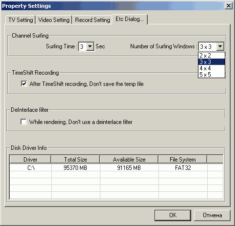 включить сохранение буферного файла для режима TimeShift (MPEG2, 352×576, постоянный битрейт 3200 Кбит/с, настройки изменению не подлежат) и включить/отключить фильтр деинтерлейса.