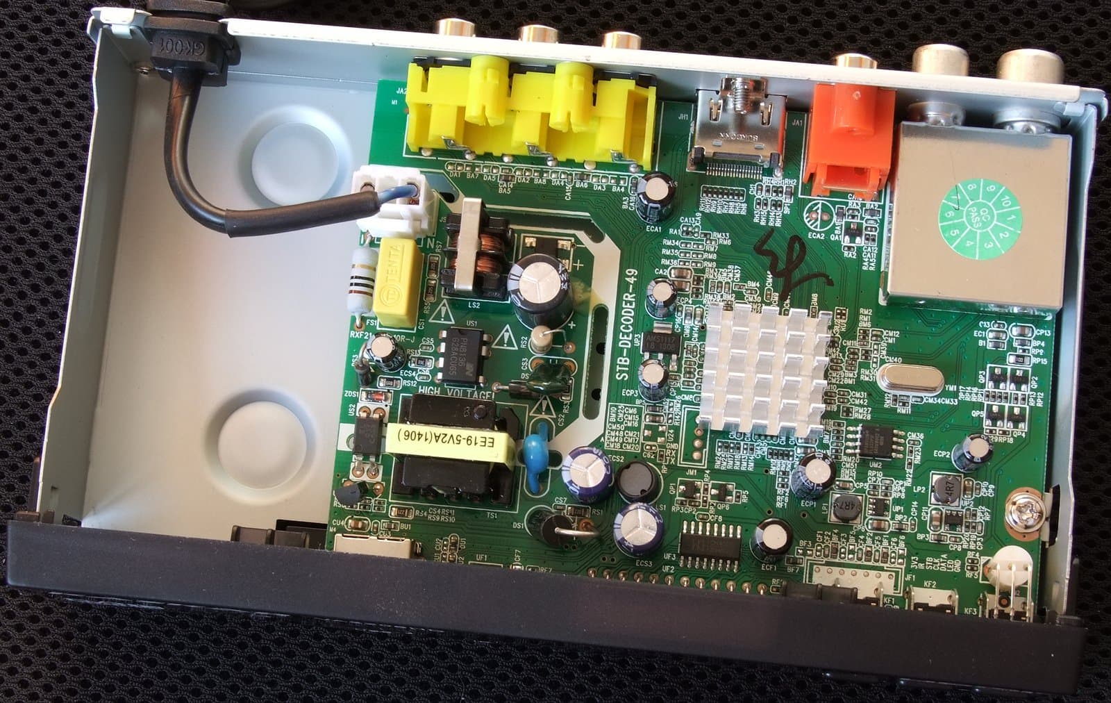 Печатная плата занимает примерно две трети корпуса, основная однокристальная система (system-on-a-chip, SoC) MSD7T01, разработанная MStar Semiconductor, закрыта радиатором.