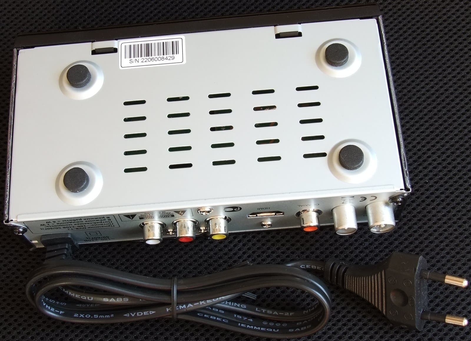 Верхняя крышка покрыта защитной пленкой, не перекрывающей доступ к вентиляционным отверстиям, в нижней части находятся 4 круглые резиновые ножки.