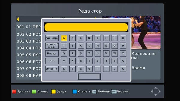 Редактор по умолчанию заблокирован паролем 000000, для деактивации достаточно ввести 888888, каналы можно перемещать, пропускать, блокировать, удалять, добавлять в пользовательский список и переименовывать, реализована экранная клавиатура.