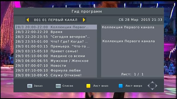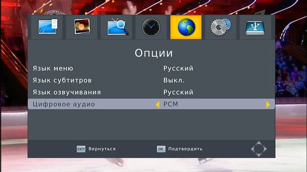 после чего становится доступен основной графический интерфейс ресивера, белый шрифт, серый фон и неяркие пиктограммы проходят по разряду «скромно, но со вкусом».