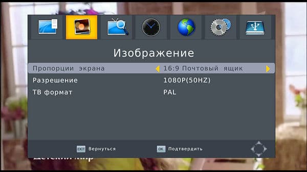 Раздел «Изображение» содержит настройки пропорций экрана, разрешения и ТВ формата (PAL и NTSC), при цифровом подключении поддерживаются режимы только с 50 (PAL) и 60 (NTSC) кадрами в секунду.