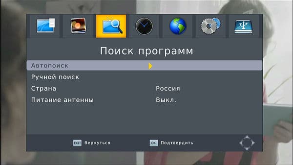В разделе «Поиск программ» можно повторить автоматический поиск, сменить регион, включить или выключить дополнительное питание антенны.
