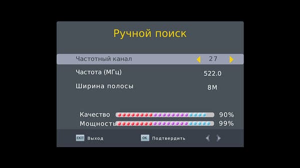 Здесь же можно воспользоваться ручным поиском. Значения качества и мощности сигнала в процентах отображаются сразу после ввода частоты.