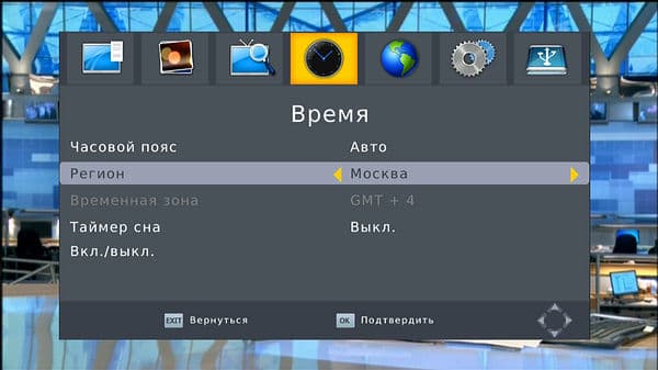 Стандарт DVB-T2 поддерживает передачу времени, в соответствующем разделе можно выбрать часовой пояс, регион и настроить таймер сна (от 1 до 12 часов с интервалом в 1 час) и время включения/выключения устройства.