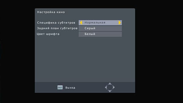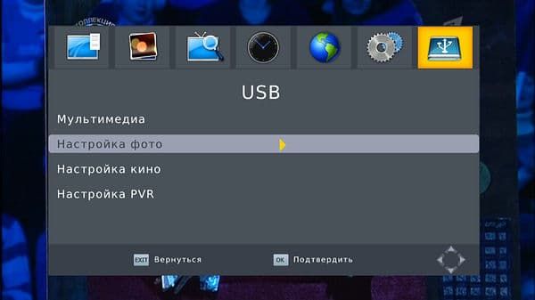 Раздел «USB» включает в себя настройки отображения графических файлов (время показа, режим показа, пропорции экрана), подраздел «Настройка кино» отвечает за параметры субтитров при воспроизведении, состоящие из выбора одного из трех размеров, почему-то переведенного как «Специфика субтитров», цвета фона (серый, желто-зеленый, белый, прозрачный) и цвета шрифта (белый, черный, красный, синий, зеленый).