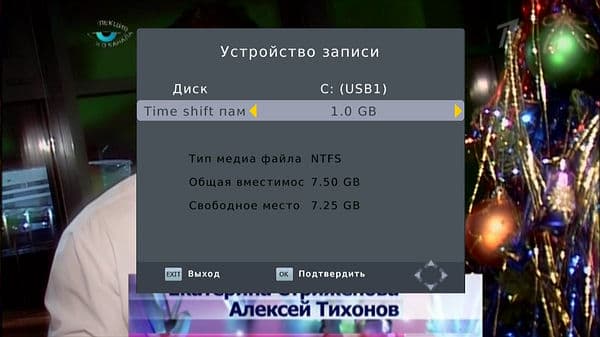 Пункт «Настройка PVR» отвечает за выбор места для функции отложенного просмотра на подключенном накопителе от 0,5 ГБ с интервалом в 0,5 ГБ, файл timeshift.ts остается до следующей активации режима.
