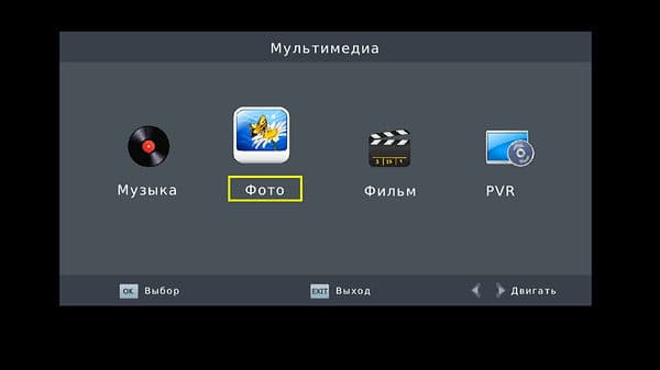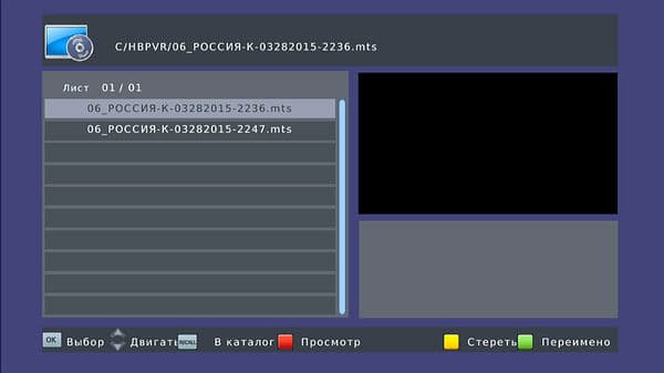 В основное меню проигрывателя можно попасть как через раздел «USB» основных настроек, так и вызовом списка записанных файлов по красной кнопке на пульте ДУ в режиме PVR с последующим нажатием кнопки Exit.
