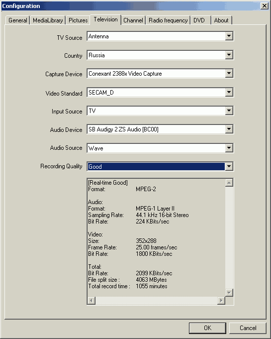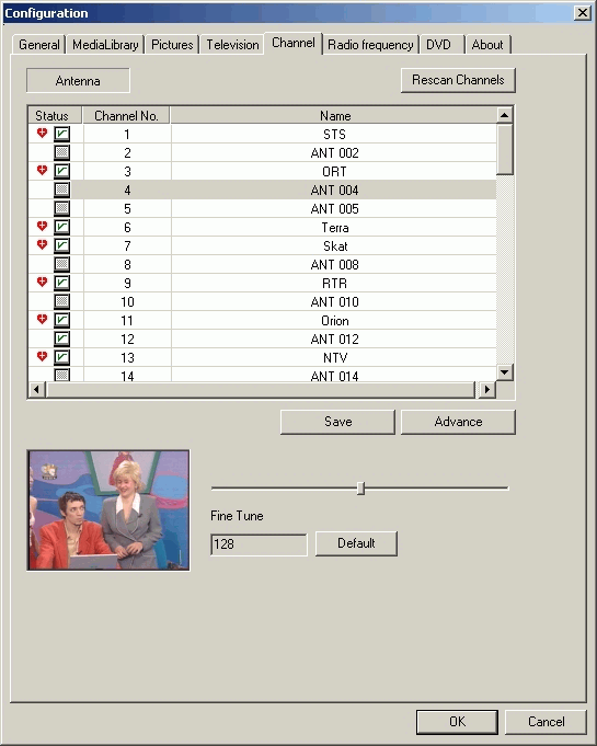 Меню настройки каналов характерно для программ от InterVideo. Отметим, что в процессе настройки пришлось столкнуться с неоднократно описанным сдвигом дециметрового диапазона по версии программы вниз на 8 каналов относительно российской сетки. Впрочем, на количестве доступных каналов и качестве приёма эта особенность не сказывается.