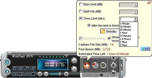 При нажатии правой кнопки мыши на иконке записи можно вызвать всплывающее окно с настройками ограничения по времени и по размеру. Здесь же можно задать выключение/переход в энергосберегающий режим после окончания записи. Пожалуй, перед нами самая изящная реализация подобной функции из встречавшихся до этого.