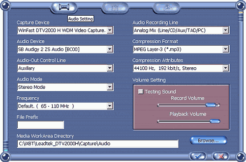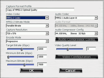 При записи в аналоговом режиме с помощью штатного MPEG1/2-кодека доступна тонкая настройка параметров вплоть до выбора прогрессивного/чересстрочного режима и минимальных/максимальных значений при записи с переменным битрейтом.