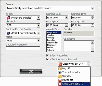 Планировщик WinFast FM также поддерживает отключение компьютера после выполнения задания.