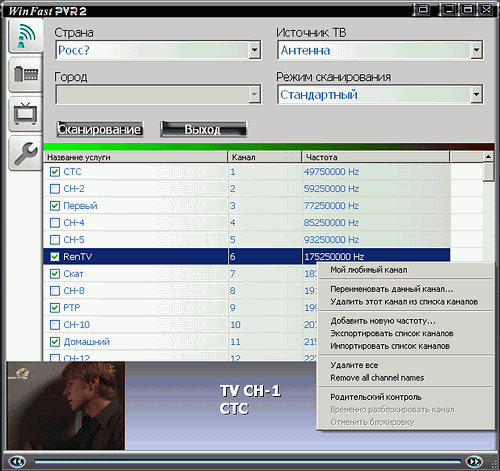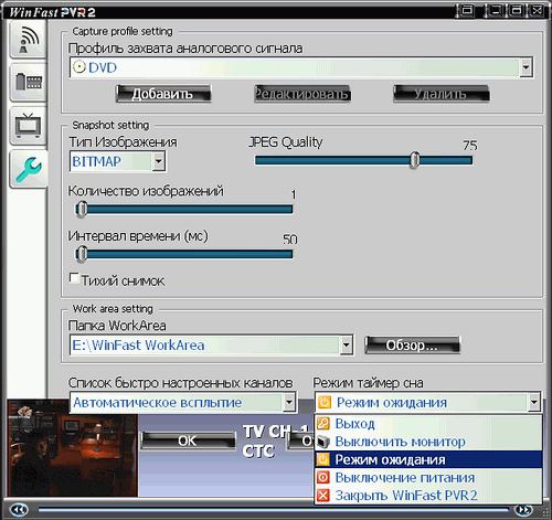 Захват кадров (как одного, так и серии с настраиваемым интервалом и количеством) осуществляется в форматах BMP, JPEG, PNG и TIFF. Возможность предварительного просмотра захваченных кадров отсутствует. Опция Список быстро настроенных каналов заслуживает подробного описания. В отличие от производителей, реализующих быстрый доступ к списку каналов через контекстное меню, вызываемое по правой кнопки мыши, Leadtek использует другой подход — список становится доступен либо при наведении курсора на верхнюю часть панели WinFast PVR2, либо при нажатии левой кнопки мыши в том же месте.