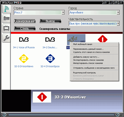 Поддерживается русский интерфейс. К сожалению, не без огрехов, в частности, достаточно давно наблюдается проблема с кодировкой некоторых символов в списке стран. Есть и хорошие новости, исправлены серьёзные неточности перевода некоторых настроек DVB-T режима.
