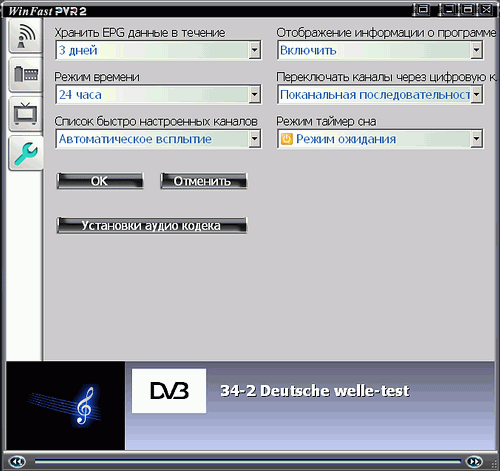 Последний раздел содержит настройки EPG, времени (12/24-часовой режим), включение/отключение OSD, режим переключения каналов (по номеру канала, по номеру в списке) и опции таймера сна (выключение компьютера/перевод в ждущий режим). Здесь же можно найти кнопку вызова звуковых настроек декодера, не нашедшую пристанища в предыдущем разделе.