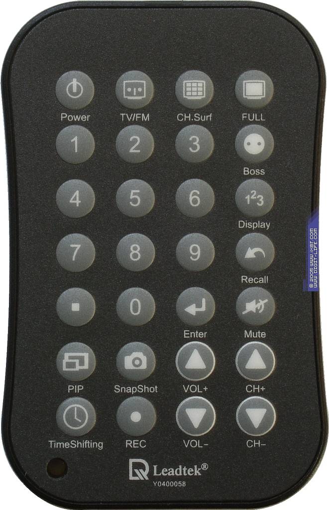 PalmTop TV/Novo TV комплектуются знакомым нам по Leadtek WinFast TV USB II Deluxe компактным пультом ДУ, выполненным в лучших традициях слим-дизайна. Пульт работает от батарейки типоразмера CR2025 3V. Дизайнеры предусмотрели отверстие для шнурка, что при таких габаритах, безусловно, является достоинством. Вызов канала осуществляется путём ввода необходимой цифры с последующим нажатием кнопки Enter. В режиме отложенного просмотра эта кнопка служит для запуска воспроизведения. Для прекращения записи используется повторное нажатие кнопки Record. Отдельно отметим фирменную кнопку Boss, при нажатии на которую работающее приложение полностью скрывается (звук при этом также отключается).Кнопка Power вызывает экранное меню, позволяющее выключить компьютер.