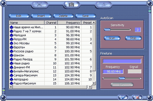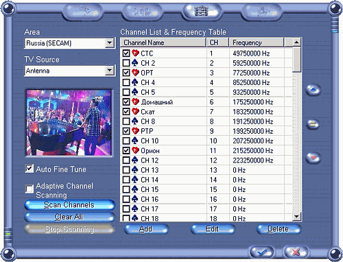 Функция Adaptive Channel Scanning осуществляет поиск по всему диапазону. В последних версиях WinFast PVR появилась возможность ручного ввода и редактирования частоты (кнопка Edit).