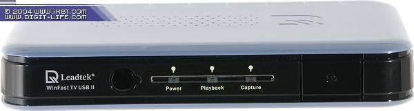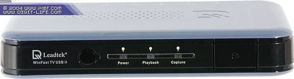 На передней панели находятся: ИК-датчик, индикаторы режимов работы (зеленый, желтый и красный соответственно) и кнопка включения/выключения тюнера. Отметим, что WinFast TV USB II является вторым после DVD2Go MPB680 попавшим к нам тюнером с интерфейсом USB 2.0, имеющим возможность физического выключения.