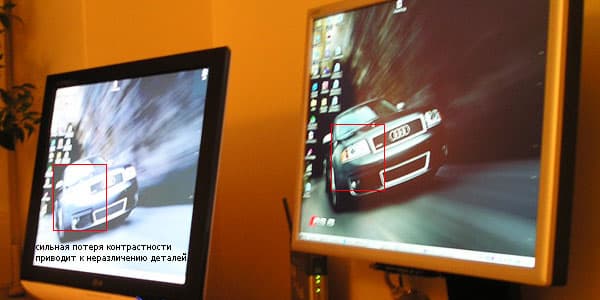 При отклонении взгляда от нормали потеря контрастности наступает довольно резко: светлые полутона высветляются, темные — сливаются с черным: