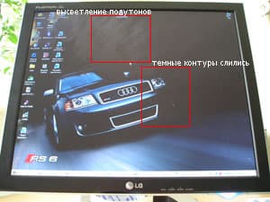 Взяв тестовый HTML LCD-тест мы обнаружили, что можно различить светлые полутона с 252.252.252 и темнее выше 3.3.3. Найти отличия 1.1.1 от 0.0.0 и 2.2.2 от 0.0.0 не удалось и в фотошопе на примере двух соседних прямоугольников размером 500×1000 пикселов.