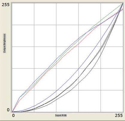 Ниже приведены графики гамма-кривых, где можно увидеть, насколько гамма-кривые индивидуальных цветов (черные линии) отклоняются от целевой гамма-кривой (синяя линия) и какая требуется коррекция для каждого цвета (соответственно красная, синяя и зеленая линии).