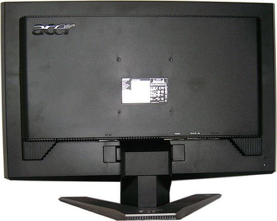 Внизу наплыв, так что логотип размещается почти горизонтально. Кнопки меню расположены на нижнем торце, но заметны и спереди, подписи — на рамке. Цвет пластика кнопок — светло-серый с серебристым оттенком. Такого же цвета накладки с боков. Но всё это в глаза не бросается, и монитор выглядит скорее чёрным в целом. Задняя часть тоже, но пластмасса там уже матовая.