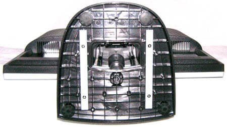 Подставка небольшая, монолитная, стоит на ней монитор надёжно. Четыре резиновых ножки прочно стоят на столе. Из регулировок доступны только наклон вперёд на 5° и назад на 20°, поворота и регулировки по высоте нет. VESA-совместимое крепление использовать можно, отверстия под него 10×10 см на задней поверхности присутствуют. Гнёзда для кабелей расположены в нише, кабели отходят вниз, и для их фиксации предлагается небольшая крышечка. Блок питания встроенный. Небольшие колоночки выведены на нижнюю плоскость рамки экрана, качество звука скорее плохое, чем омерзительное. Вполне удобно там же расположено гнездо для наушников.